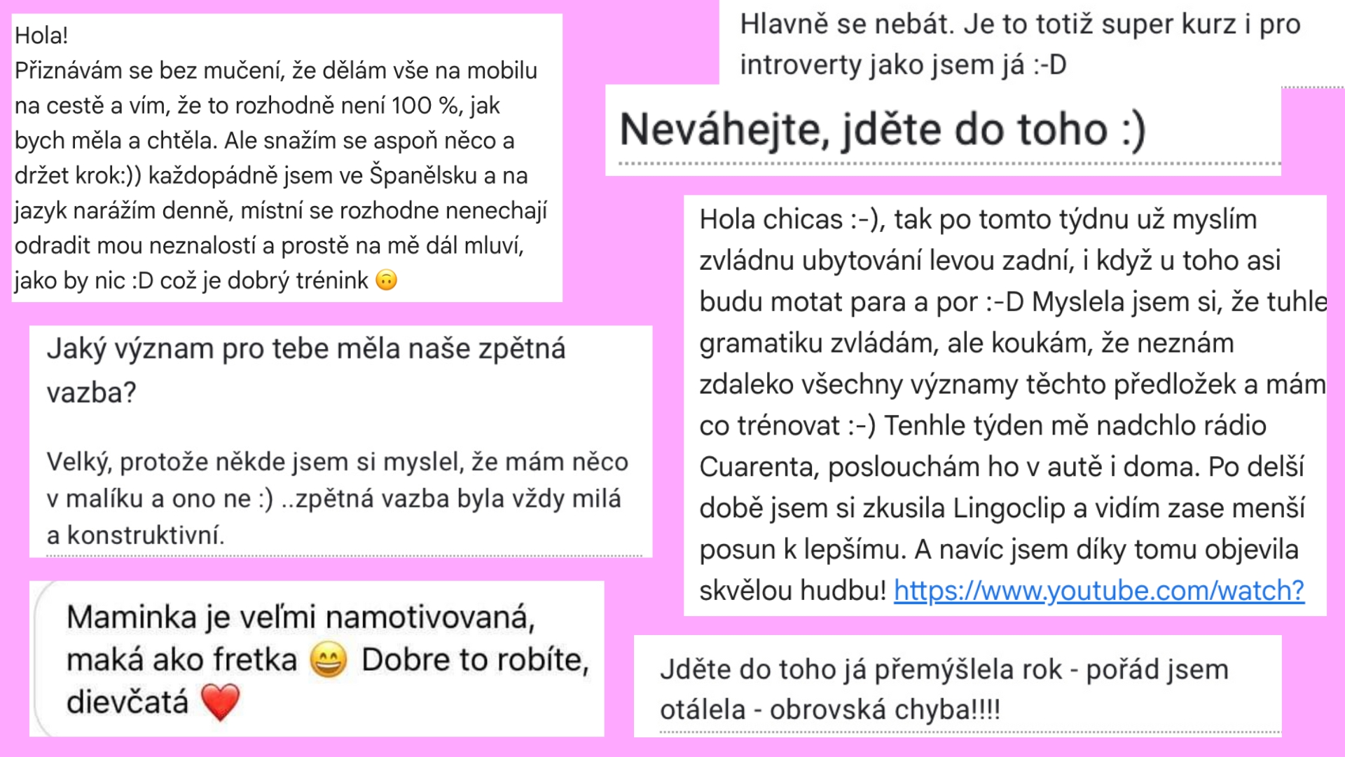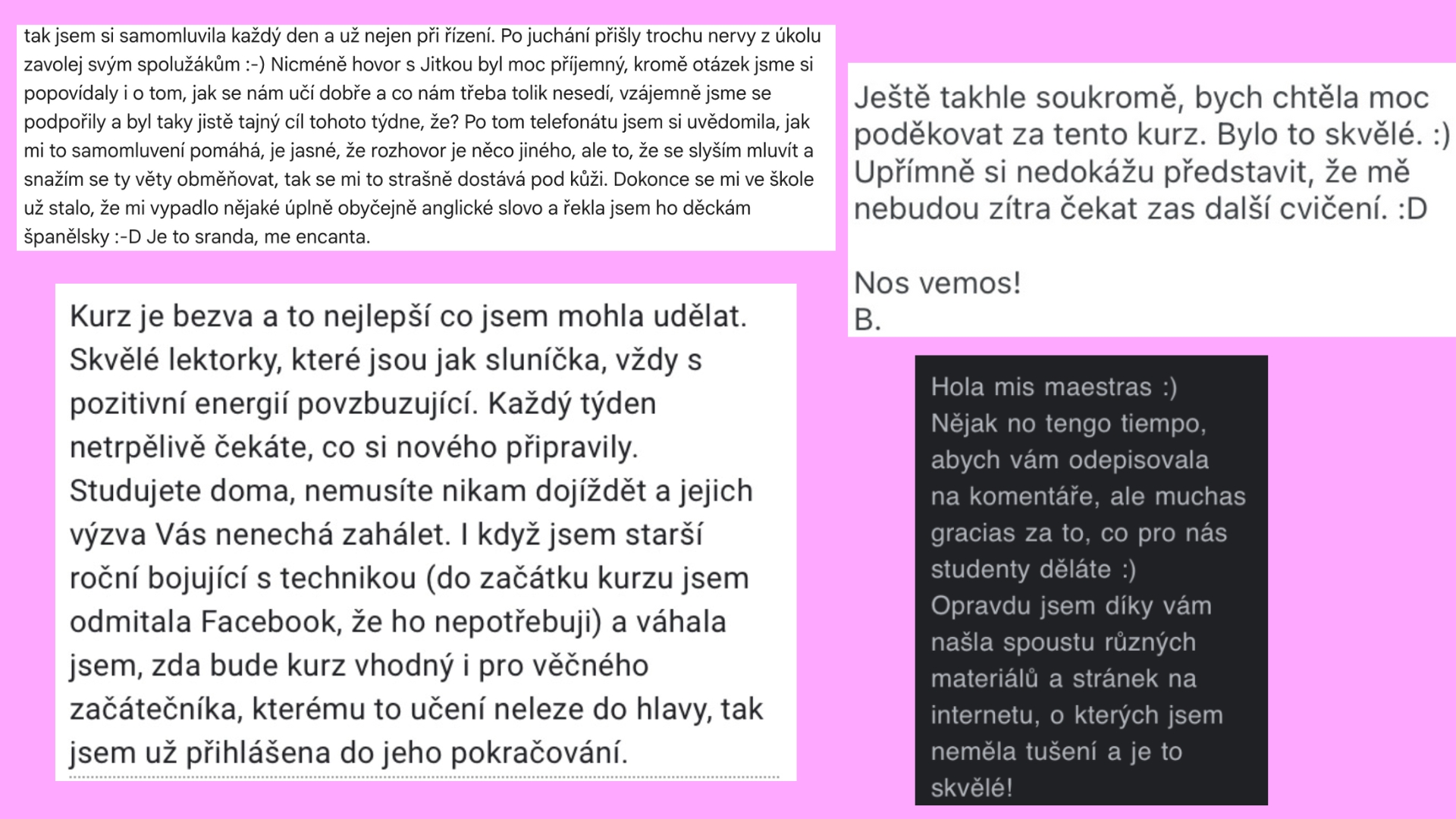 1–2 hodiny samostatné práce týdně. Výpisky si uděláš u stolu nebo ve vlaku, podcast si pustíš při úklidu, klikačky zmákneš během pauzy na oběd. Večer si pustíš Netflix s filmem ve španělštině a máš hotovo!