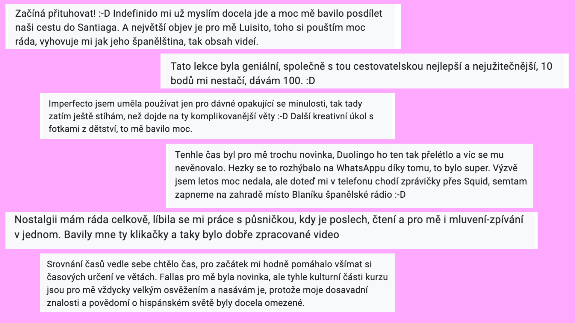 ¡Sí! Přihlas se i ty! Potřebuješ si udělat pořádek v minulých časech, nikdy nevíš jestli je to hablaba, habló nebo he hablado? Případně jsou pro tebe minulé časy novinkou? V kurzu si obě skupiny najdou svoje. Můžeš splnit jen základní úkoly nebo se zkušeně ponořit i do těch bonusových.